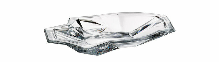 Kristallen Bord uit de lijn Enigma van het Tsjechische merk Bohemia. De Bord is rechthoekig, heeft een asymmetrische vorm en de textuur doet denken aan het oppervlak van een blok ijs. Dit enorme stuk kristal is versierd met deinende golven die bevroren zijn in de tijd.