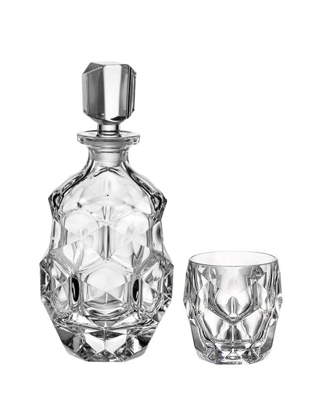 Bohemia Whisky set uit de Lunar collectie heeft een elegant modern ontwerp. Het ziet er chique uit en zal elk interieur perfect verrijken met een luxueus element. Vul de fles met je favoriete whisky, brandy of rum en geniet er op je gemak van. Dankzij de perfect passende steel zal alle geur op je wachten. Geschikt als cadeau voor alle liefhebbers van fijne whisky en kwaliteitsglaswerk. Gemaakt van massief loodkristal.