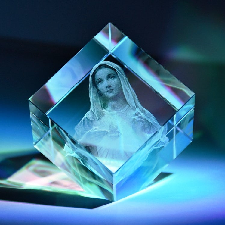 Lasergesneden 3D-afbeelding van de Maagd Maria in een glazen kubus van 60x60x60 mm met een gekrompen hoek.