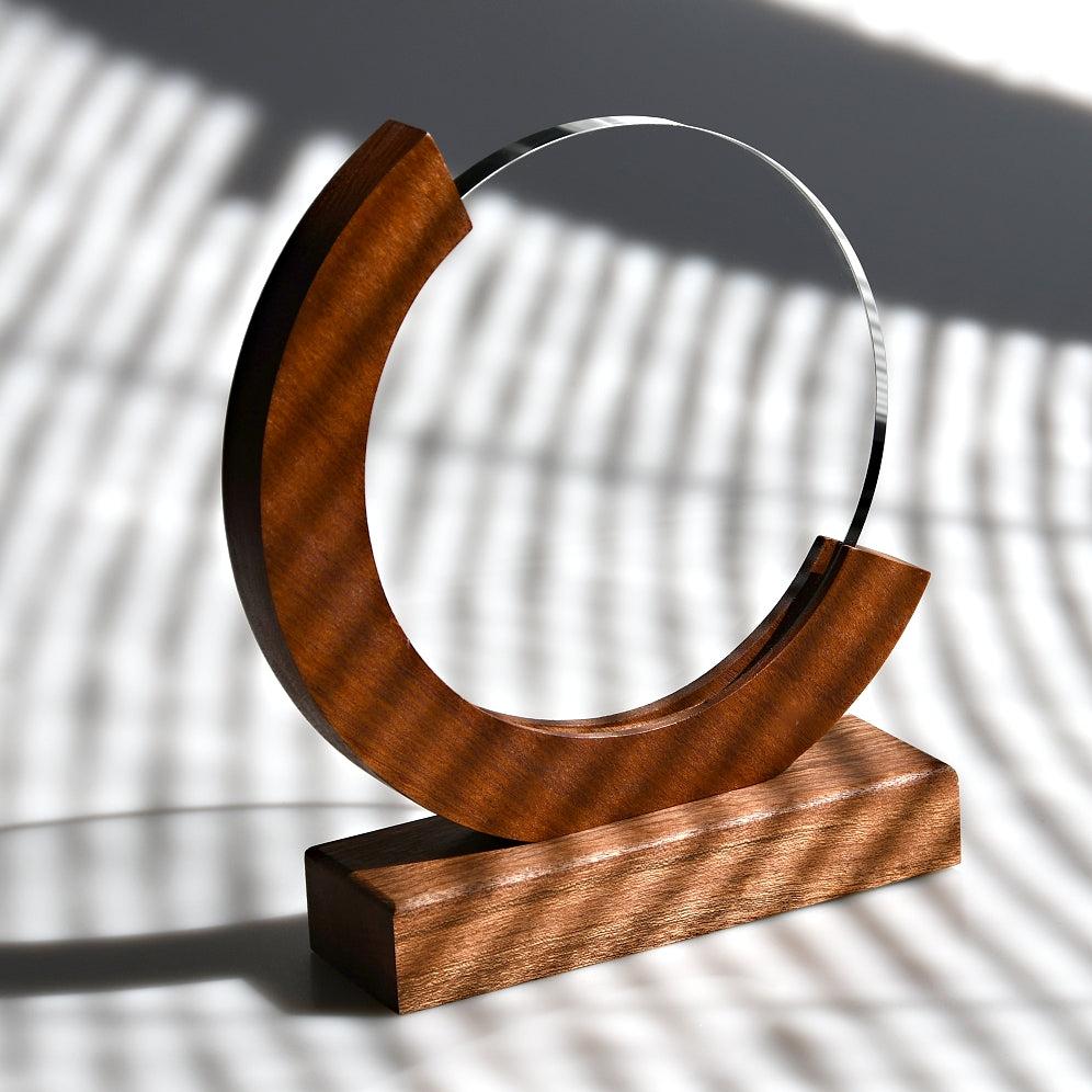 Plaquette - Ronde plaquette in houten frameVerpakking: geschenkverpakkingGewicht product: ca. 800 gAfmetingen: diameter glas: 145 mm, voet...