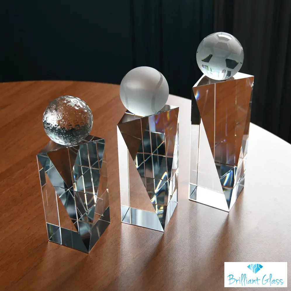 Set glazen trofeeën - glazen sportbal, wereldbol of heldere glazen bal met een diameter van 60 mm op een geslepen blok.Te gebruiken als trofeeën voor de 1e, 2e en 3e plaats.